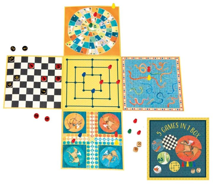 I denne æske finder du 5 spil: skak, gåsespillet, ludo, Morris men og slanger-og-stiger. Her er alt hvad du har brug for, for at spille alle spillene.