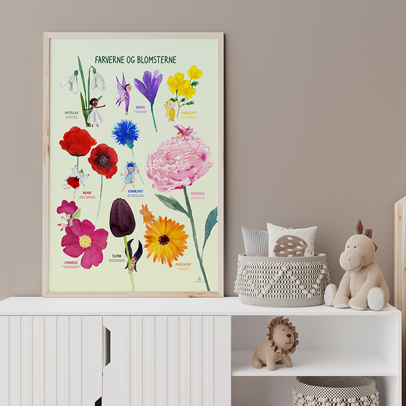 Ved at arbejde med blomster og farver skaber plakaten en tidlig interesse for naturen og omgivelserne. Barnet lærer at lægge mærke til detaljer og opdage sammenhænge mellem det, der hænger på væggen, og det, der findes udenfor. Det styrker barnets nysgerrighed, opmærksomhed og respekt for naturen – kompetencer, som rækker langt ud over farvelære.