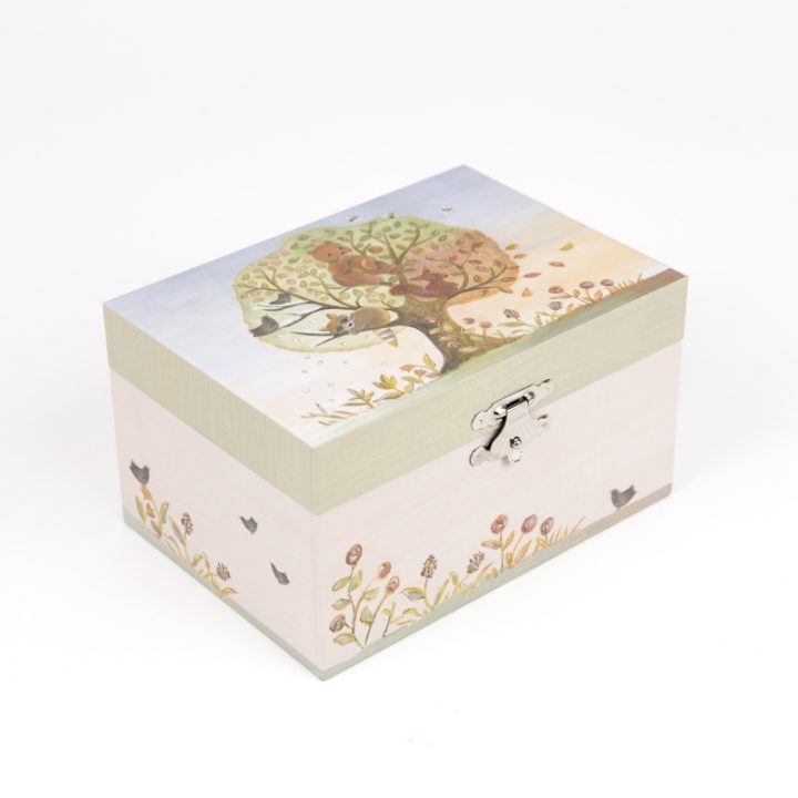 Dette fine smykkeskrin med smukt print af de 4 årstider, som kan gå til både drenge og piger. En sart lyserød farve i inderstof, ovalt spejl og den mest nuttede lille bamse, der snurrer rundt til musikken. En dejlig gave-ide til både store og små, hvor små skatte og hemmeligheder kan opbevares.